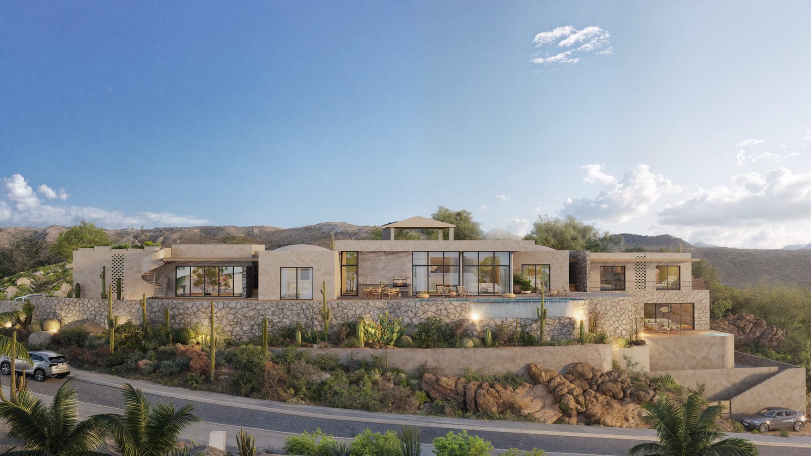 Water is the guiding element of the project: a fountain welcomes visitors at the entrance patio, an infinity pool accompanies the social area, and a second fountain is integrated into the yoga area. The architectural language is minimal and luminous, aiming to convey serenity, spatial transparency, and a constant relationship with the surrounding environment.