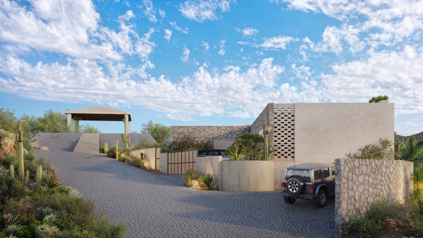 The house connects to its gardens through paths and corridors that articulate different landscapes: a cactus garden, fruit tree areas, floral patios, and contemplative spaces that allow for a natural, meditative circuit throughout the property.